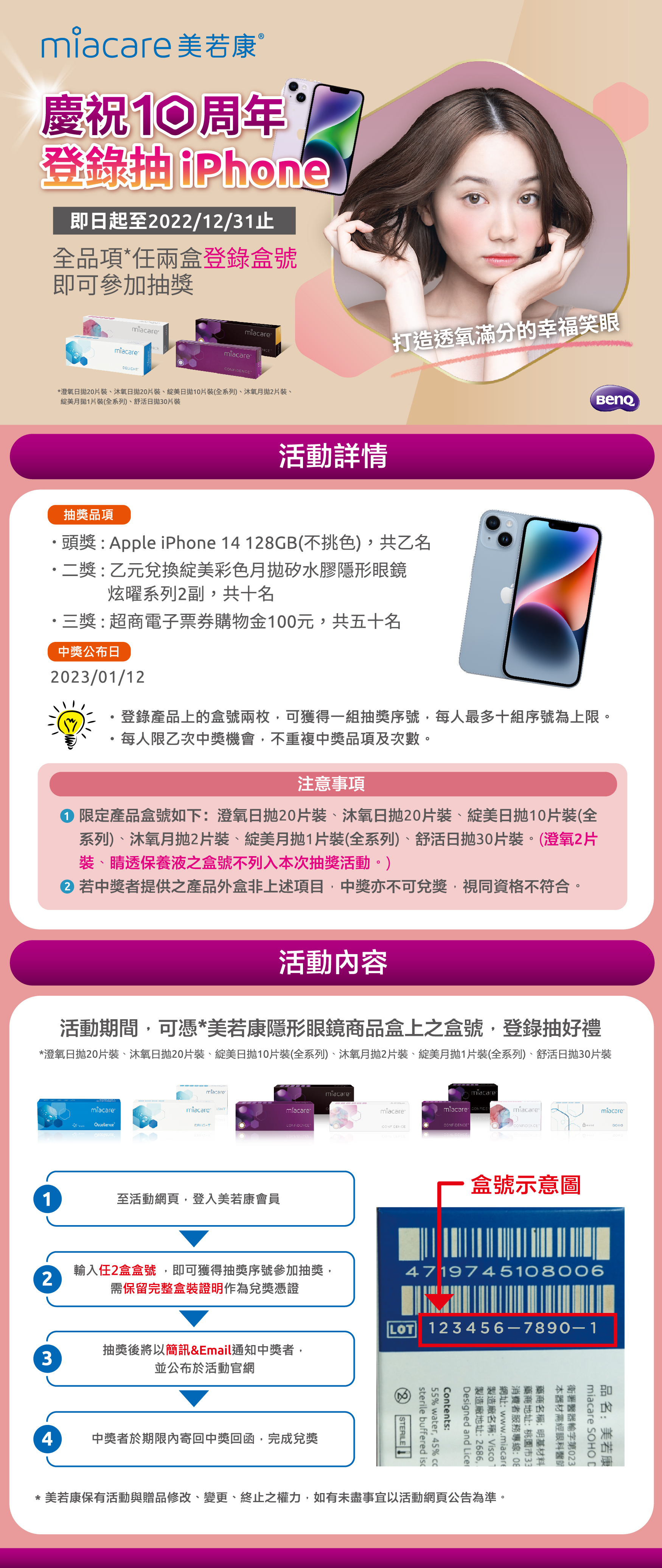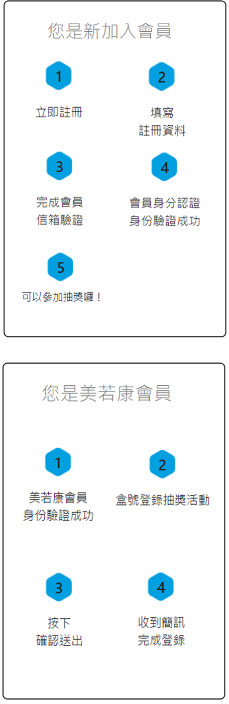 2. 參與活動者需保留完整盒裝且盒號清晰可辨視始符合抽獎資格;每人限一次中獎機會(依美若康會員帳號為準) ;此活動每個會員帳號,限定登入10組序號(每組需任2盒未參加過抽獎活動之盒號),才可登錄抽獎。抽獎地點為明基材料股份有限公司,將依各期公佈時間公告於活動網站,如遇假日則公告順延至次一工作日。